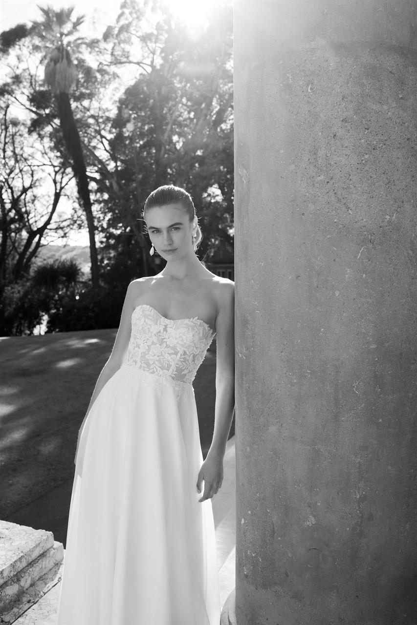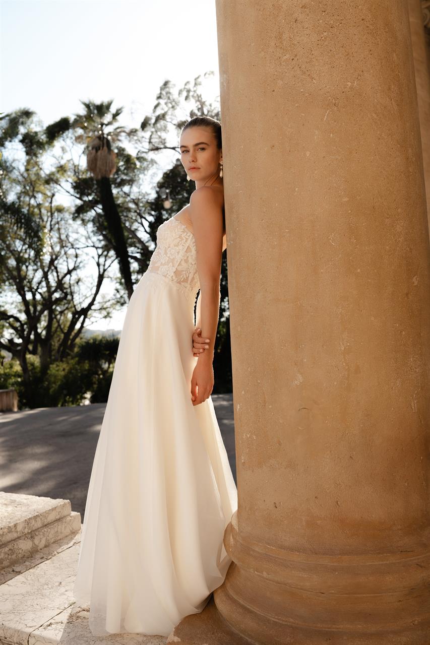 Dans la robe Abigail vous serez une mariée au style moderne ! Les épaules découvertes dévoile un corsage sans bretelles composé d’applications florales ivoire et de petites perles. La jupe évasée en organza fluide possède une traîne courte et donne une tonalité vaporeuse.