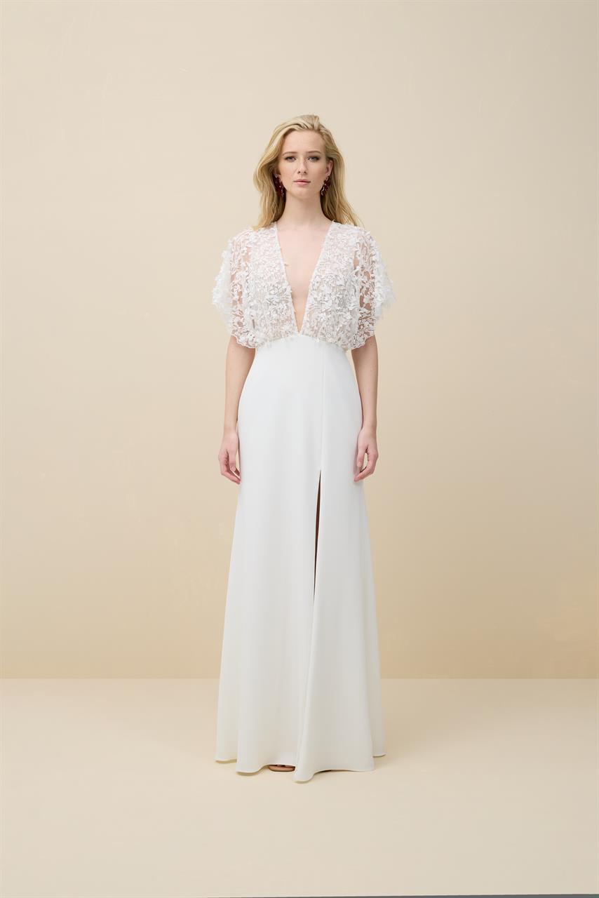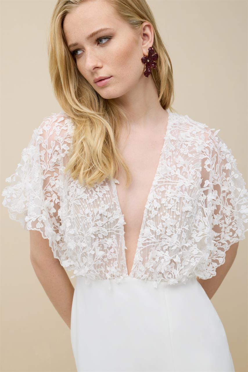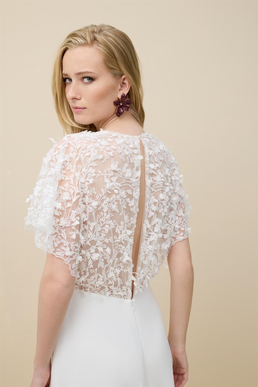 Le haut de la robe de mariée Bleuet est fait de tulle brodé de fleurs qui se drape sur les épaules. C’est une robe moderne au style unique. Son décolleté est très plongeant alors que le dos présente une fine ouverture verticale.
