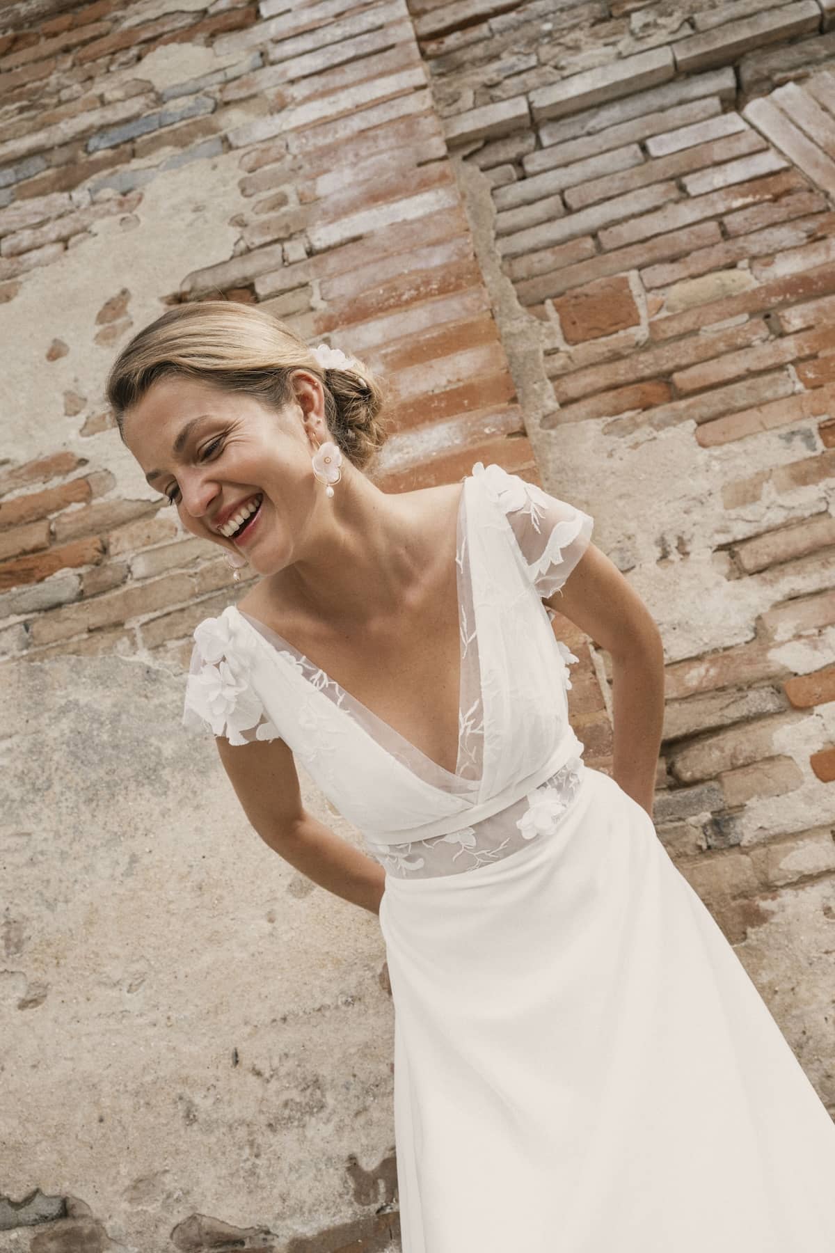 Son décolleté plissé avec des incrustations de fleurs soigneusement cousues, sa ceinture qui épouse la taille complètent parfaitement la légèreté de la mousseline.