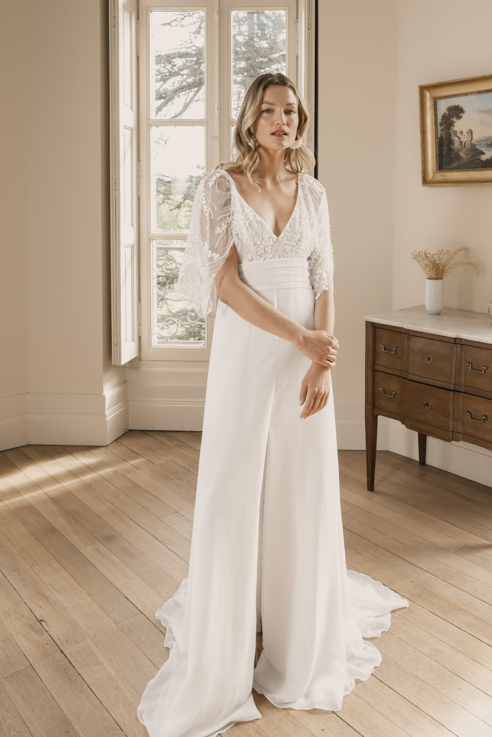 La taille de la robe Hanaé est soulignée par une large ceinture sous poitrine qui flatte la silhouette et le décolleté.