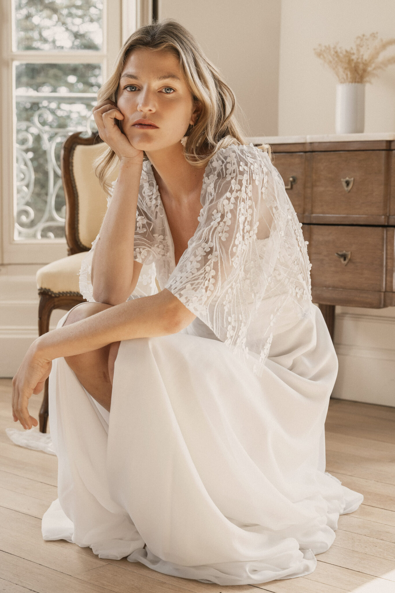 Le tissu en relief, orné de petits pétales et de délicates perles de rocailles lui donne une sophistication élégante.