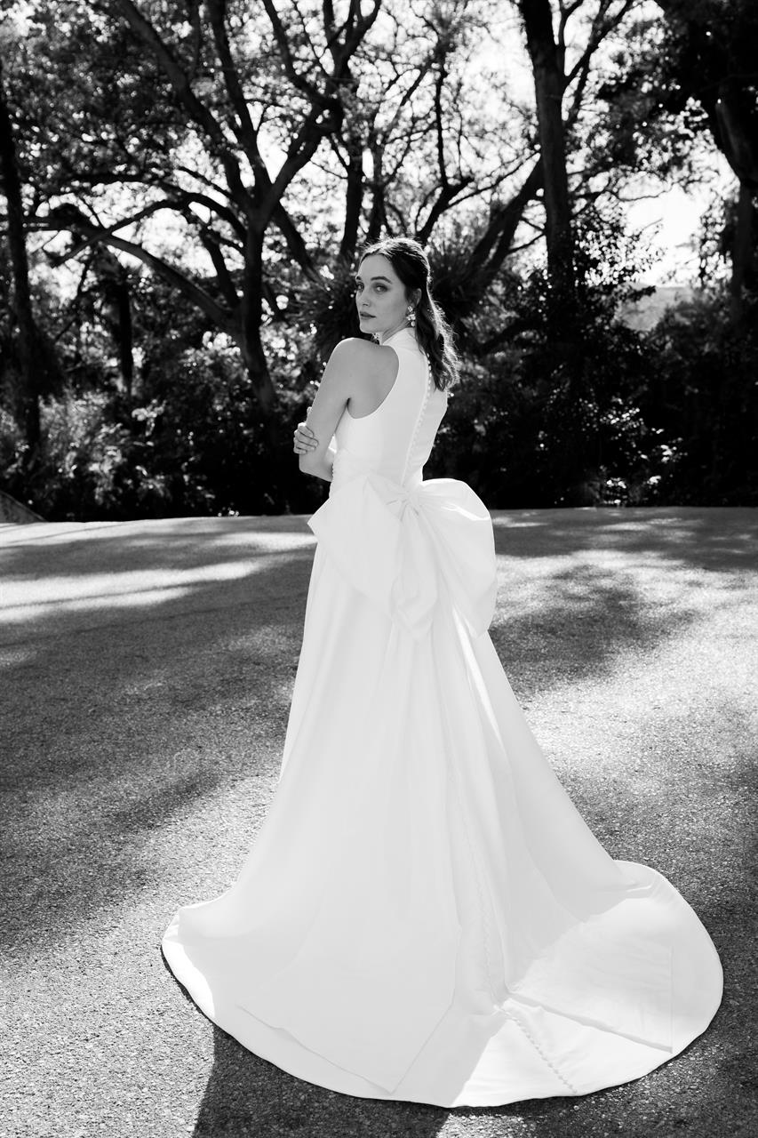 Let Me Love You est en mikado avec une  grande traîne chapelle. Et pour le bonheur de photos stylées, c’est une robe avec des poches ! Le corsage présente un décolleté en V avec un petit col. Une ceinture plissée en taffetas souligne la taille et se termine par un grand nÅ“ud. Les deux sont amovibles.