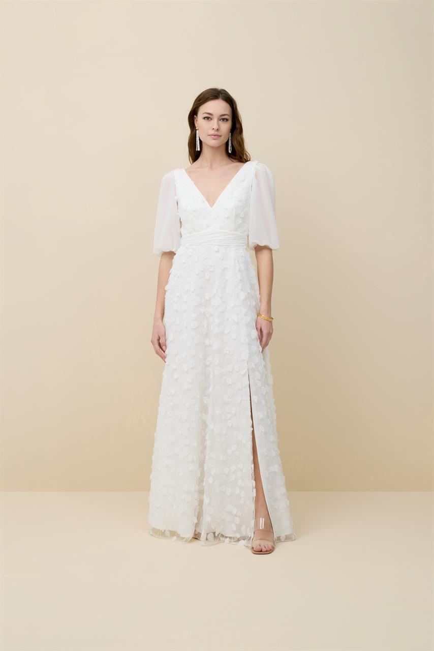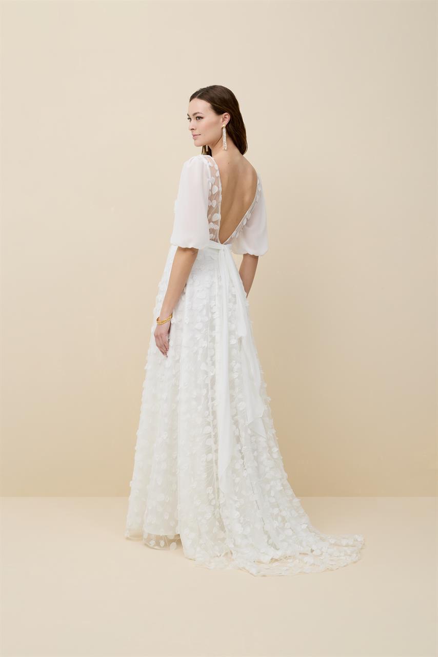 Les manches 3/4 en mousseline sont amovibles ! Une ceinture en mousseline dessine la taille. La jupe entièrement recouverte de tulle à fleurs identique à celui du corsage est fendue sur le côté.