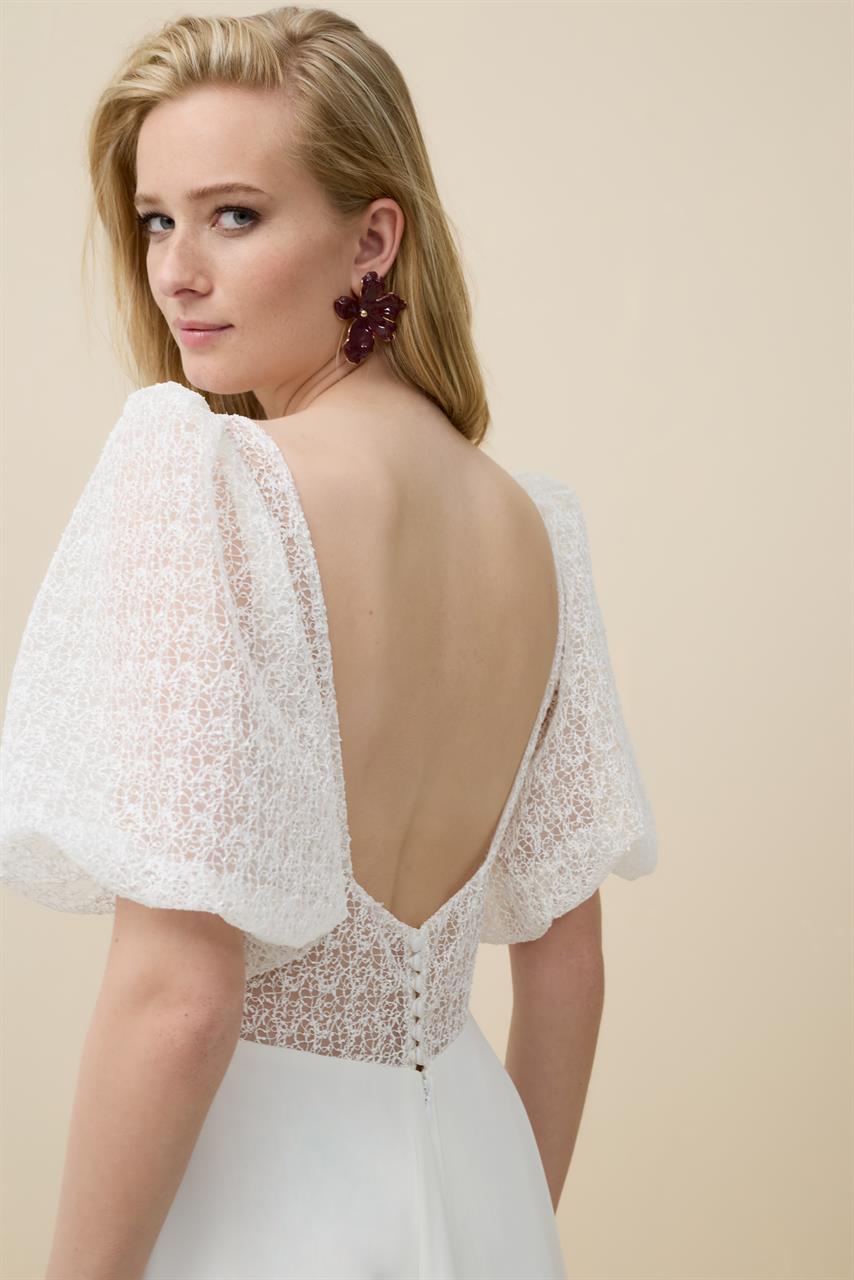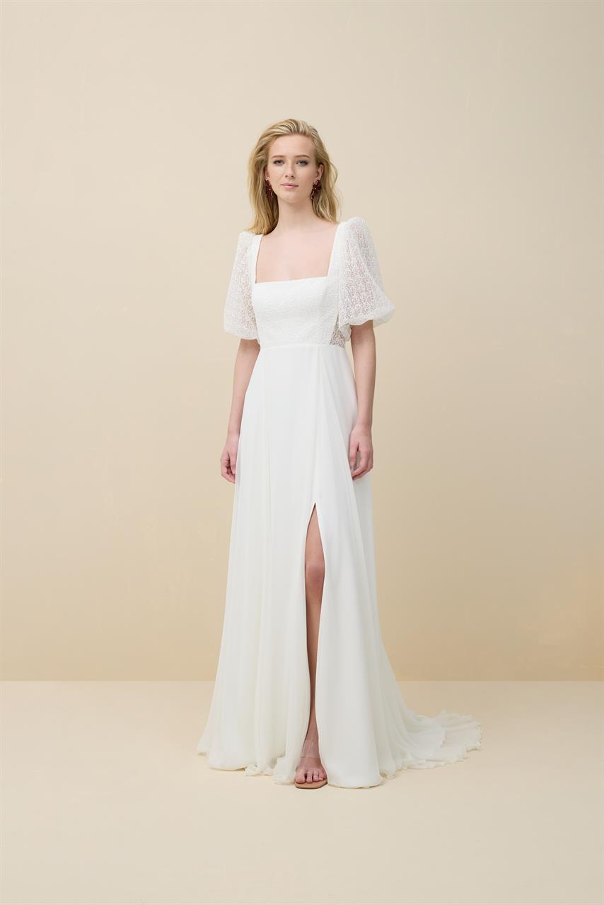 Perfectly est une robe de mariée élégante et moderne. Son haut brodé se définit par une encolure carrée, un dos ouvert et des grandes manches lanternes.  Perfectly est en crêpe mais est recouverte d’un joli voile en mousseline qui dévoile une élégante  fente sur le devant.