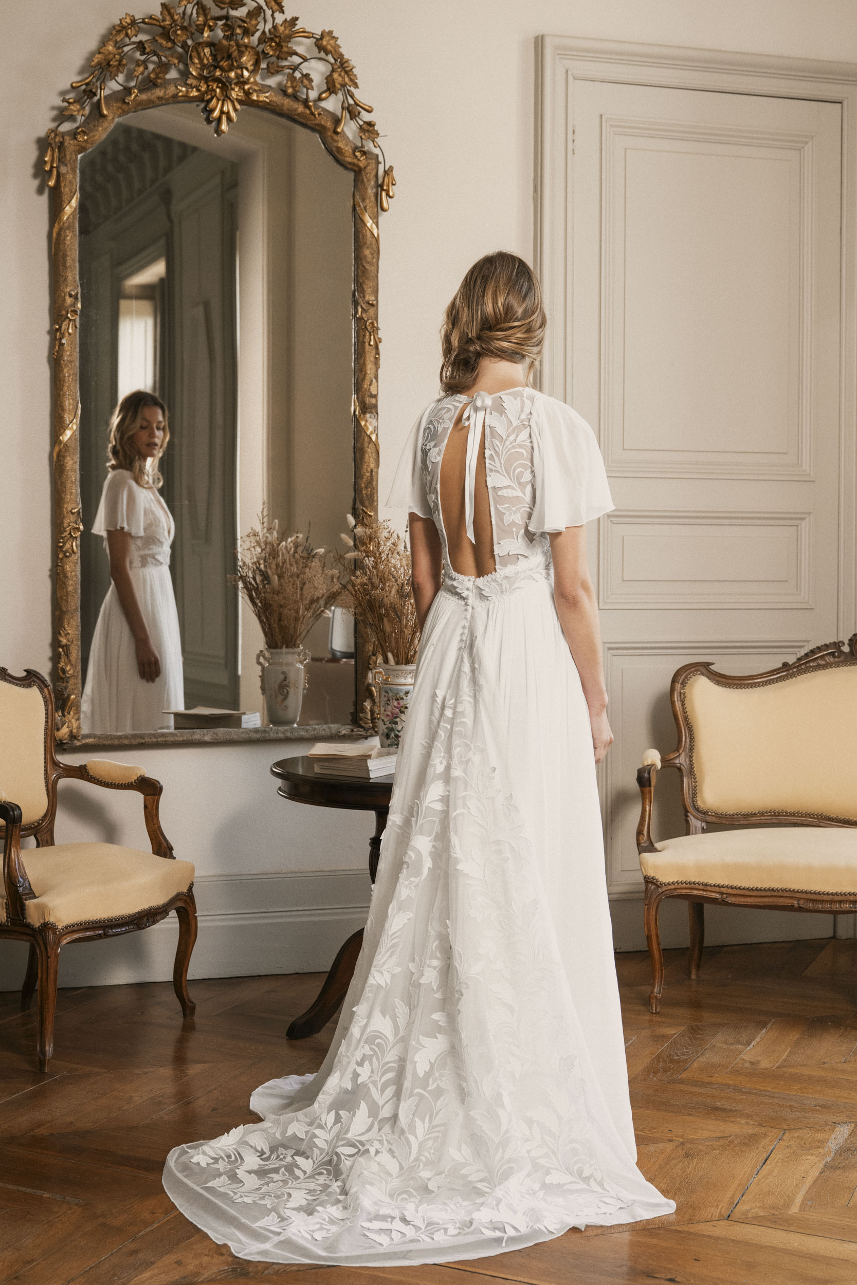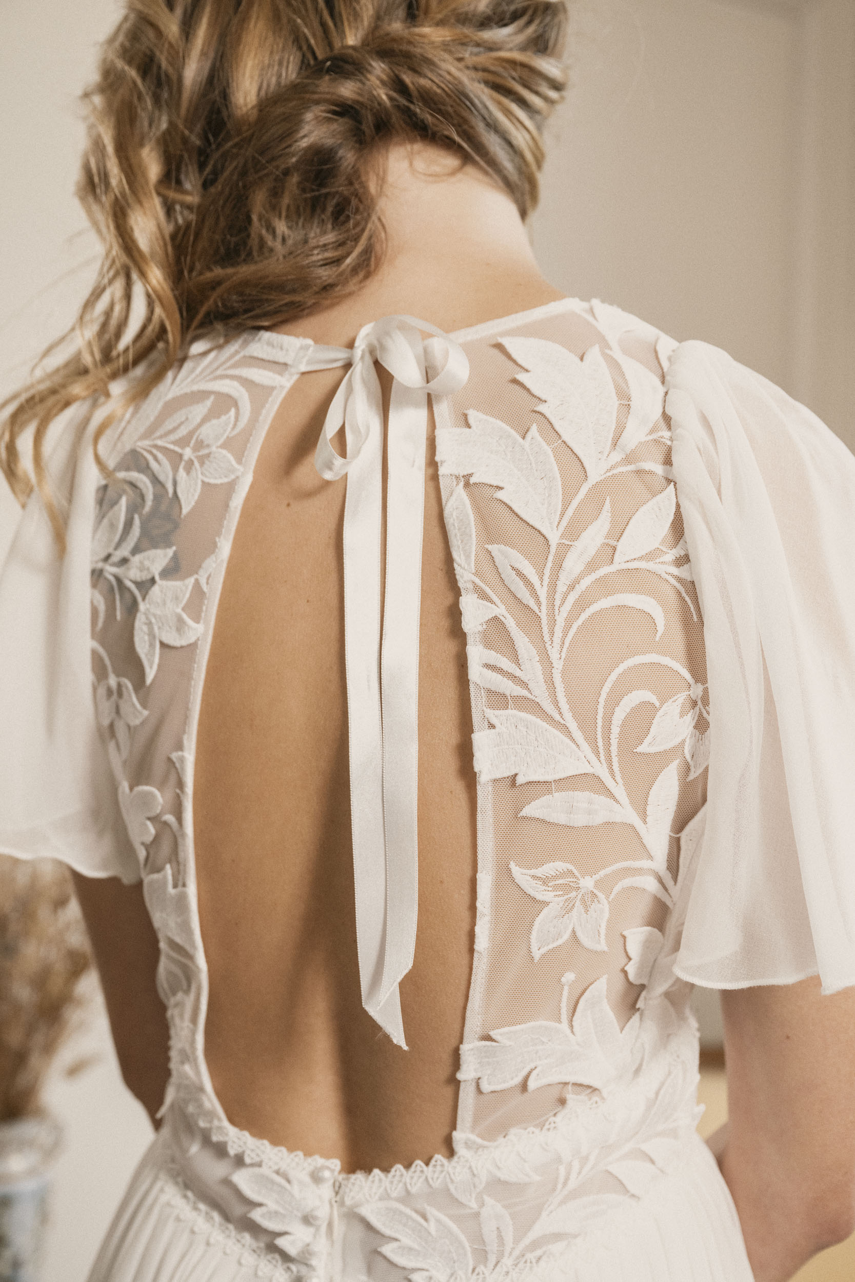 La robe Prudence est une robe affirmée et légère à la fois. Son jeu de dentelle graphique allie du caractère à la douceur de sa jupe fluide et plissée en mousseline. Créée pour les mariées modernes en quête de style mais aussi de simplicité et de poésie bohème. C’est une robe structurée et pleine d’allure.