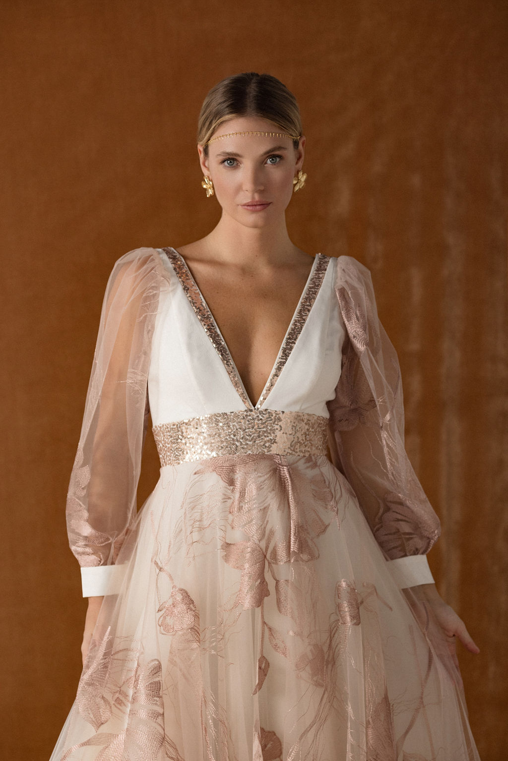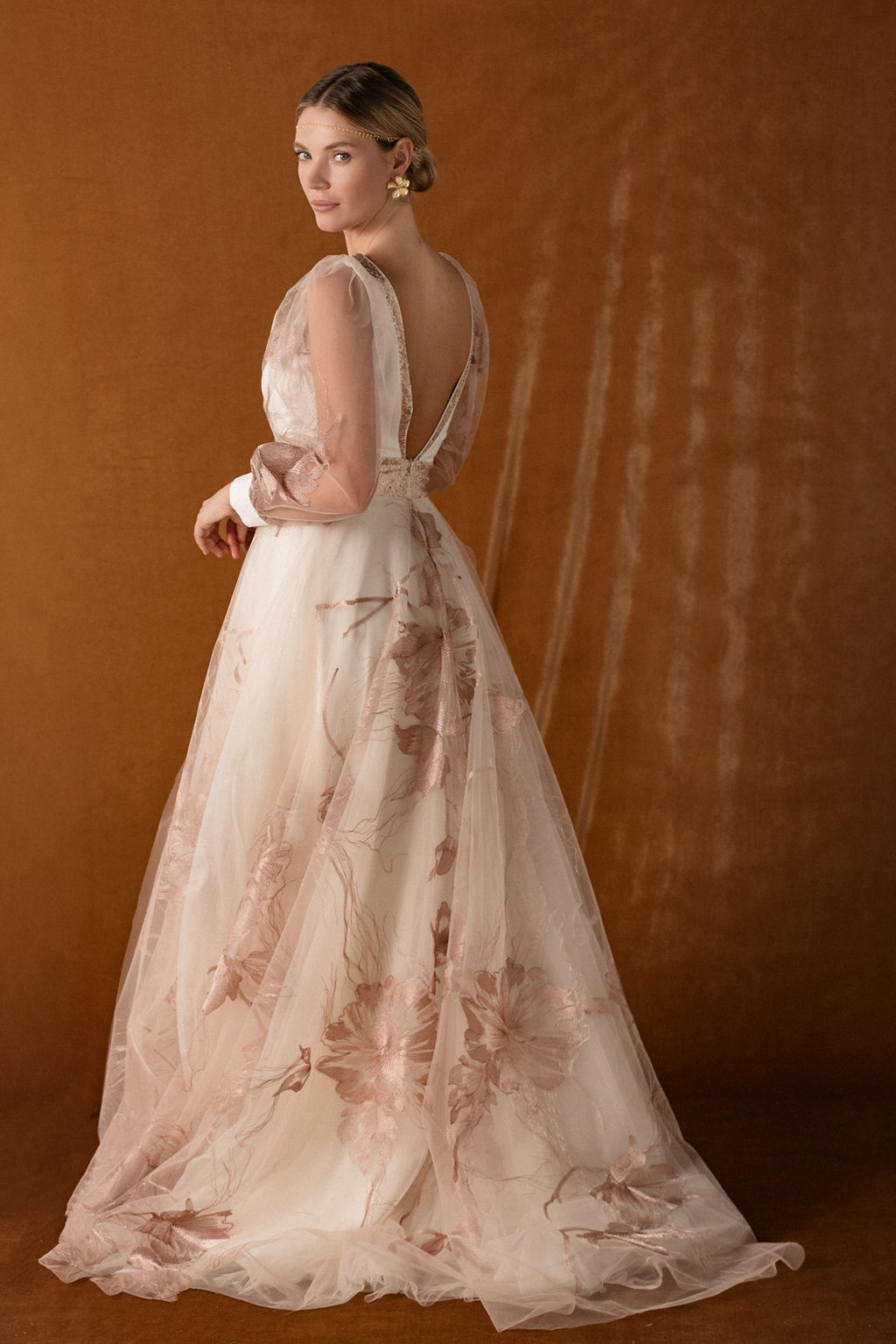 Sa couleur, le rosé et le doré en font une robe de mariée affirmée et au fort caractère. C’est une pièce majeure de la collection 2026. La taille est parfaitement ajustée pour souligner la silhouette et le buste, tandis que la jupe en tulle brodé donne un peu de volume. Les manches longues finissent d’apporter le chic à la robe.